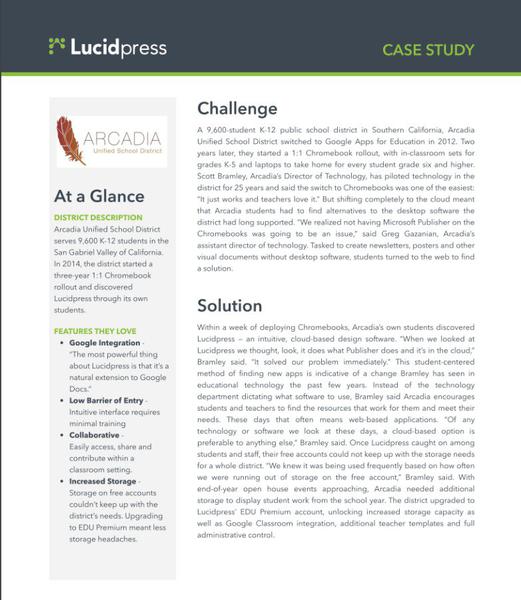 Lucid Software • 14th August 2015 Lucidchart Case Study: Arcadia USD Arcadia Unified School District serves 9,600 K-12 students in the San Gabriel Valley of California. In 2014, the district started a three-year 1:1 Chromebookrollout and discovered Lucidpress through its own students.
