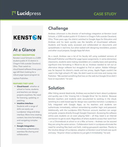 Lucid Software • 2nd May 2016 Lucidchart Case Study: Kenston Schools Kenston Local Schools is a 3,000 student public K-12 district in Chagrin Falls outside Cleveland, Ohio. Their switch to cloud-based software three yearsago left them looking for a robust page layout program to replace Publisher.